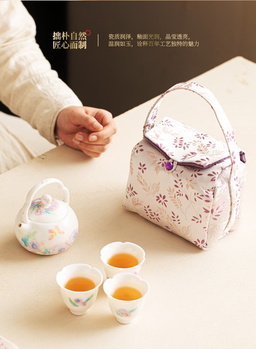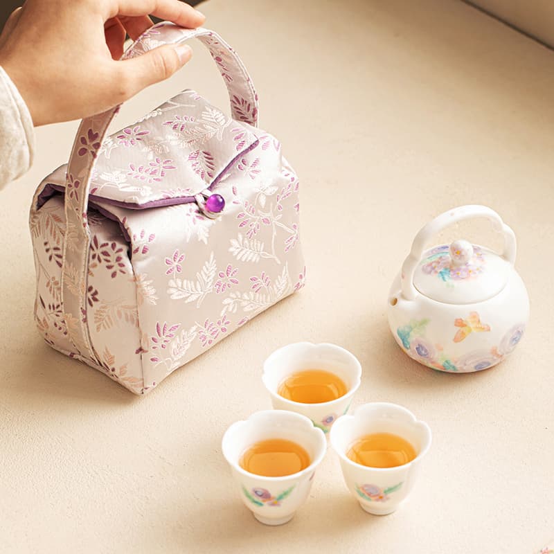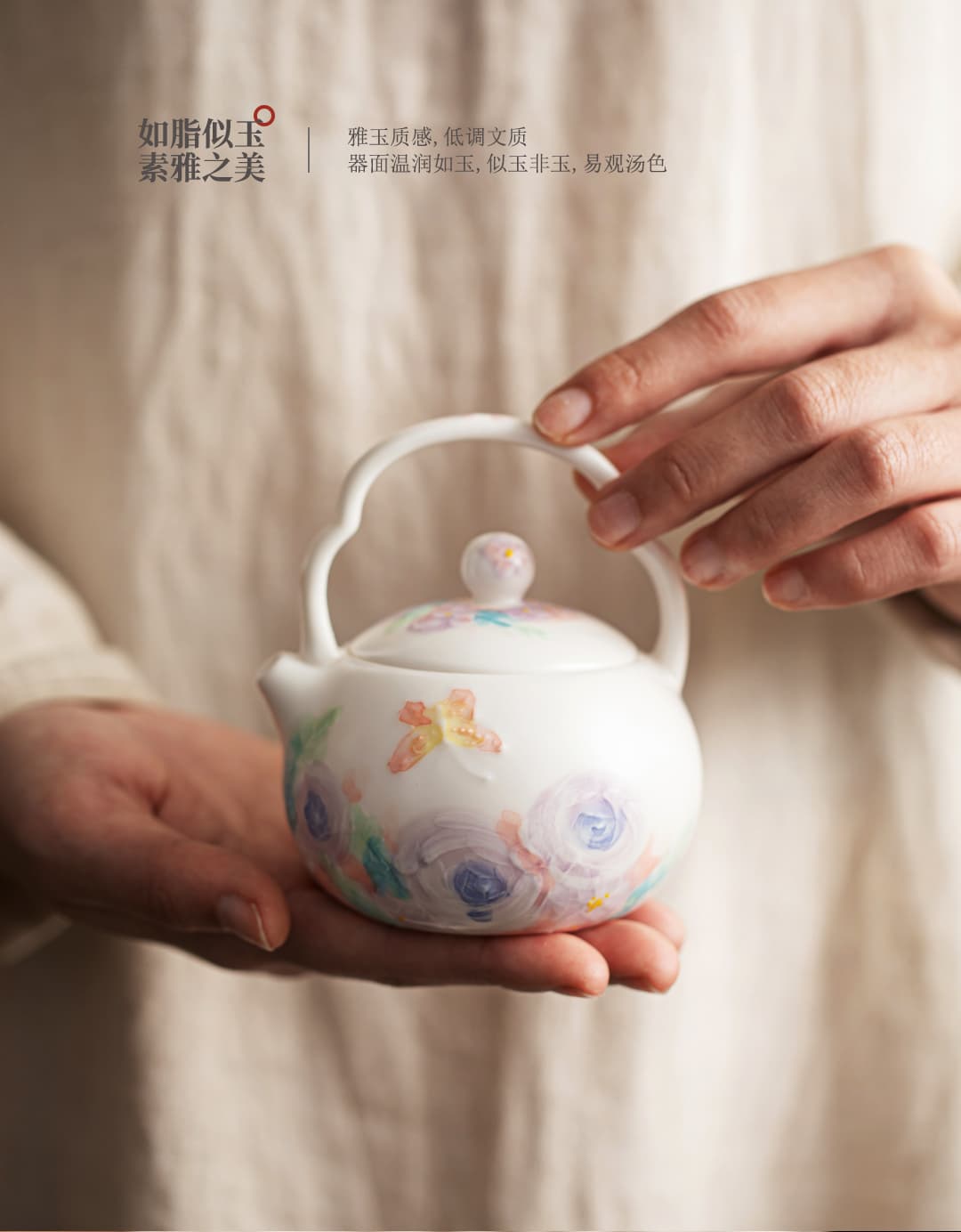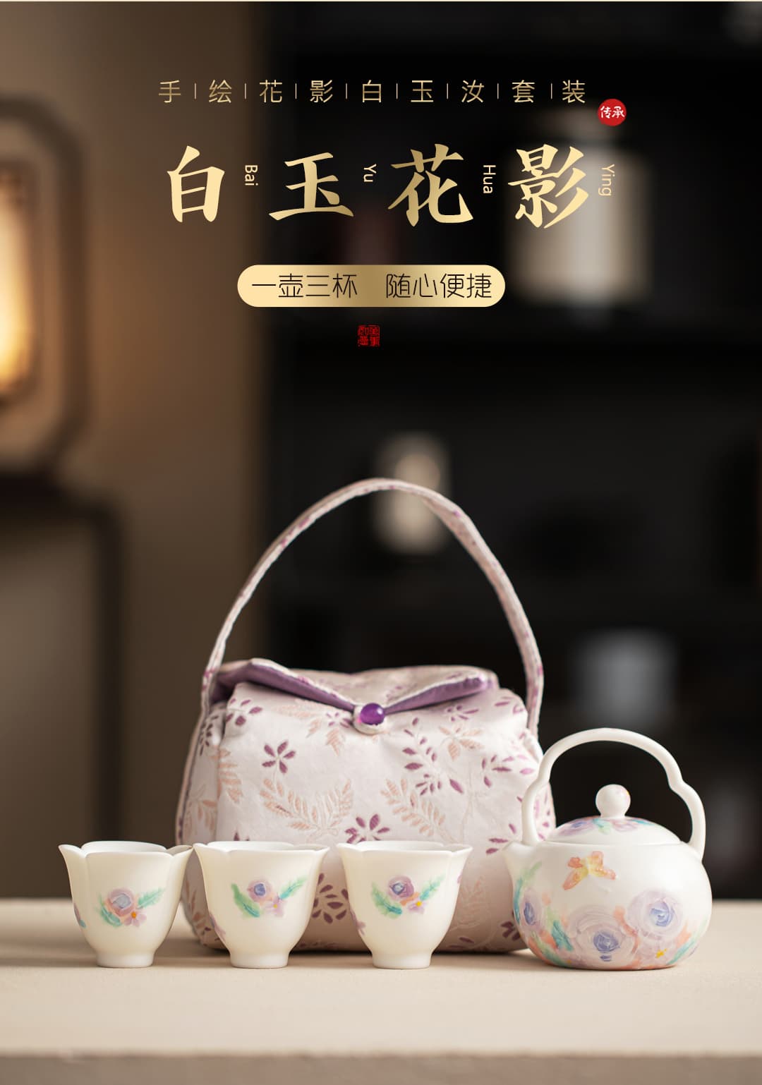 尾桥下窑白玉汝花影一壶三杯套装手绘陶瓷茶具礼品定制