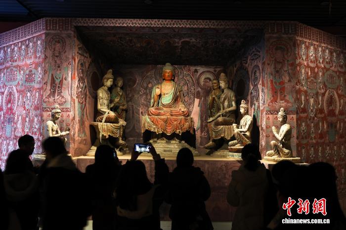 12月27日,江西南昌,江西省美术馆“丝路回望·瓷上中国——釉色里的敦煌”特展展出的敦煌莫高窟第328窟(复制件)吸引参观者。“丝路回望·瓷上中国——釉色里的敦煌”特展汇聚了89位中外陶瓷艺术家的作品150多件,通过洞窟式、高温颜色釉瓷板壁画、拼接式瓷片、瓷雕等多种艺术形式,系统展现了敦煌壁画、雕塑艺术与陶瓷艺术的共生魅力,为观众带来了一场精彩的文化盛宴。中新社记者 刘力鑫 摄