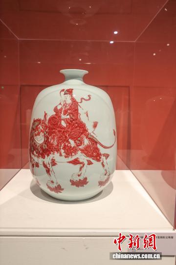 12月27日,江西南昌,江西省美术馆“丝路回望·瓷上中国——釉色里的敦煌”特展展出的釉里红瓷器《敦煌榆林三窟文殊经变图的文殊像》