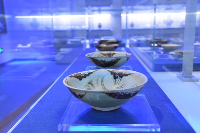 “丝路华章——唐代青花瓷瑰宝展”上展出的代长沙窑青釉褐斑褐绿彩草叶纹碗。